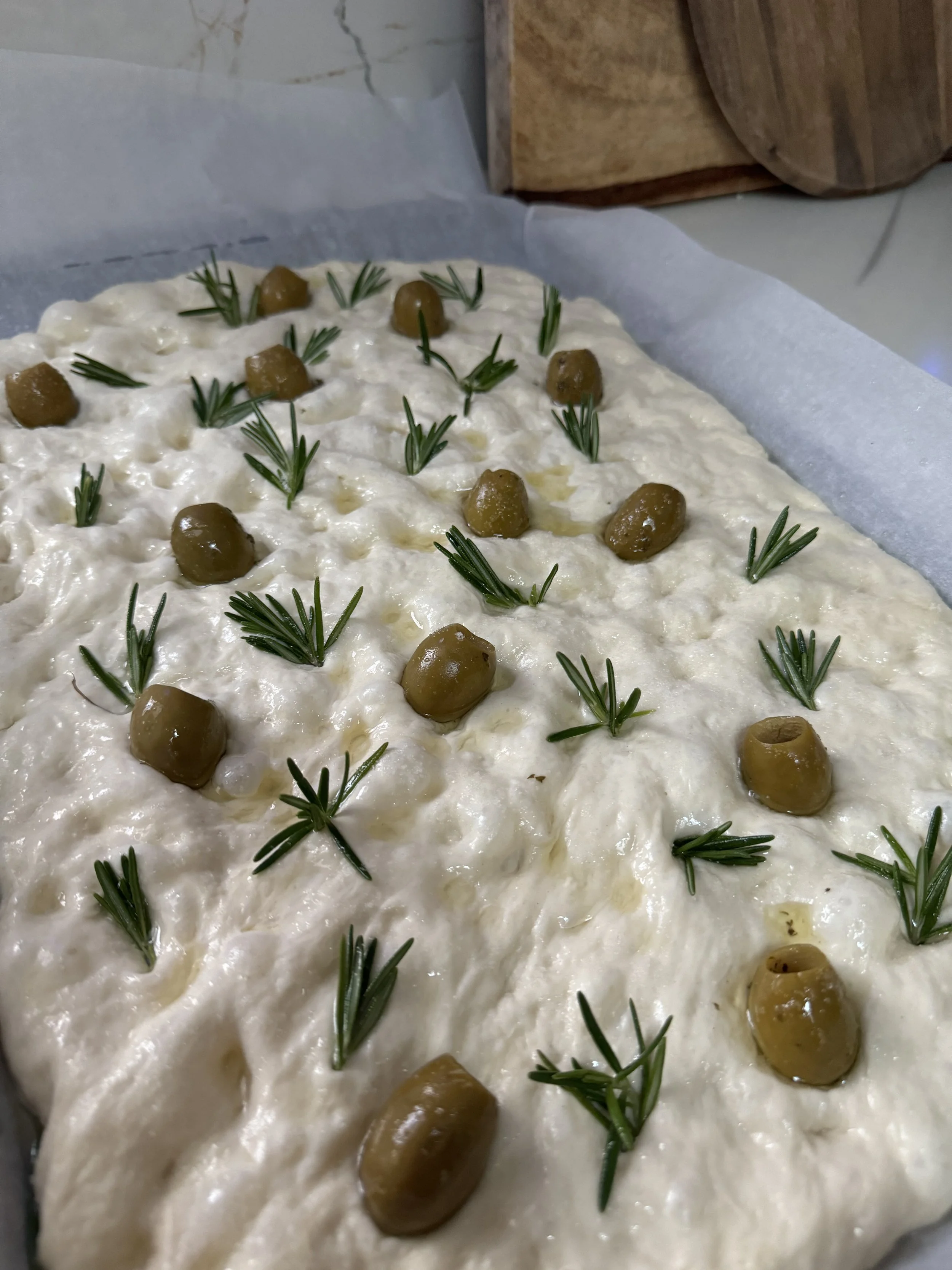 Lightly oil a baking pan with parchment paper, then gently stretch the dough into it—no rolling pins needed! Stretch it out to fit the size of the baking pan. Use your fingertips to create those signature dimples across the top, then press in your rosemary sprigs and olives. Dont forget to add some oil to the rosemary leaves so they don’t burn. Then be generous and drizzle the top of the dough with olive oil —it’s what gives focaccia that golden, crisp edge. Then sprinkle the top with some sea salt.