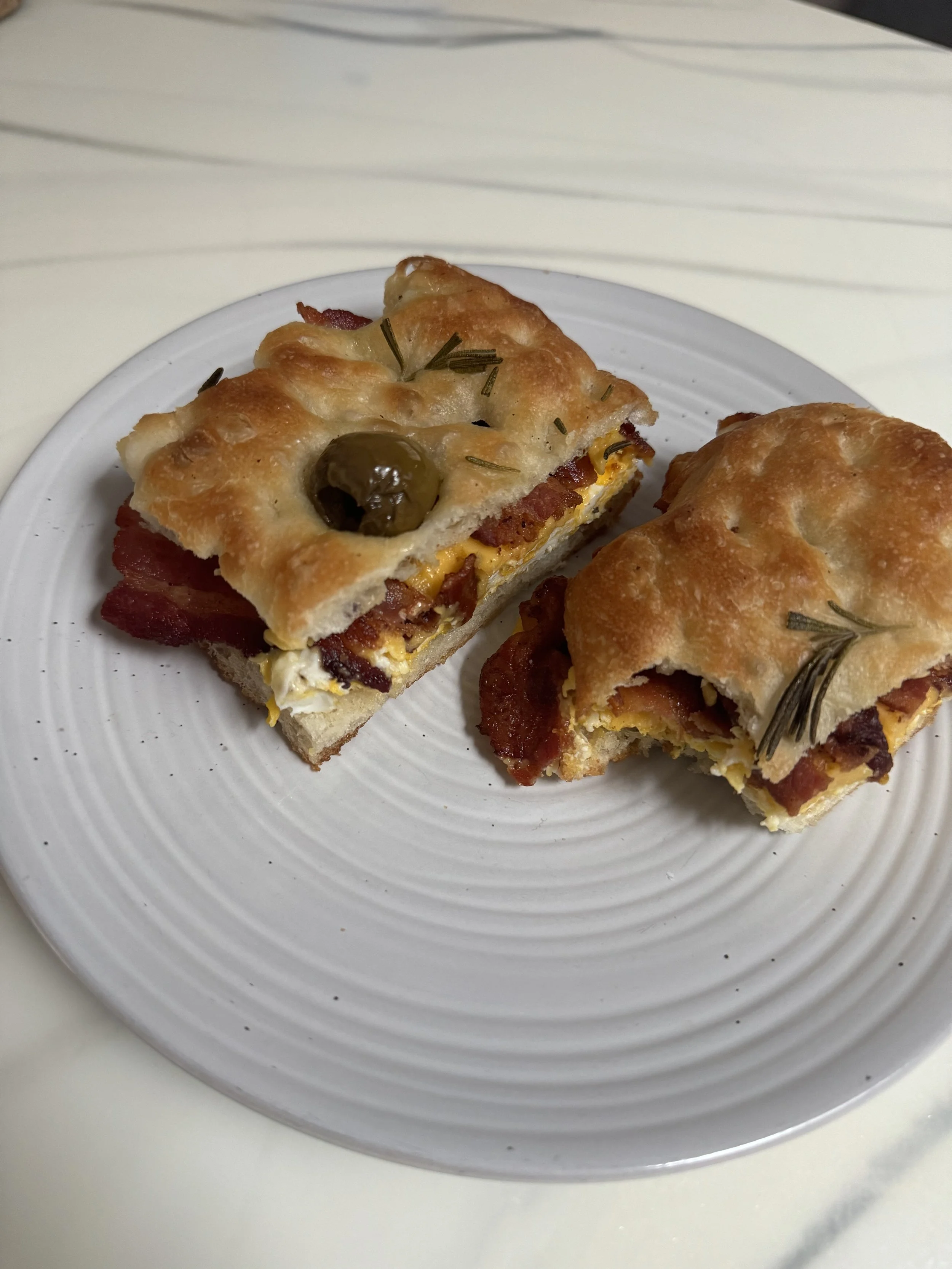 I love serving this focaccia warm with a drizzle of olive oil, a sprinkle of flaky salt, and a small plate of balsamic vinegar for dipping. It pairs beautifully with soups, salads, or even as a base for sandwiches. I made myself a classic bacon, egg and cheese sandwich one morning and it just felt so much more elevated. It’s simple, satisfying, and feels like self-care in bread form.